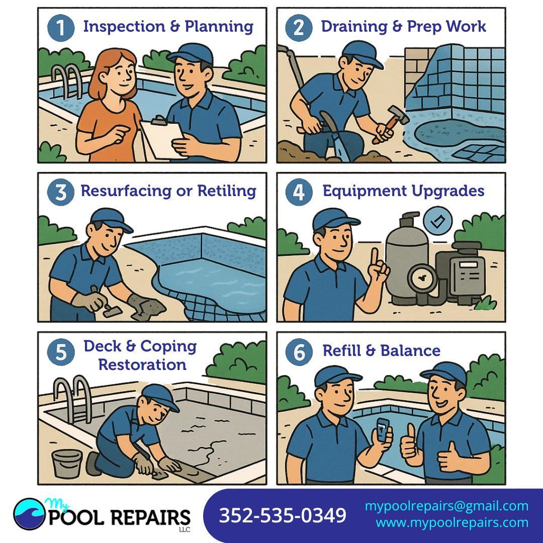 1⃣ Inspection & Planning – We start by assessing your pool’s current condition, discussing your goals, and recommending upgrades that fit your style and budget.
